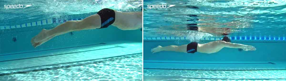 6. Tiếp tục bằng động tác đạp nước mạnh lùi về sau và khép chân lại để lấy phản lực nước tiến thân người về phía trước, toàn thân trở lại tư thế ban đầu. Chúng ta sẽ thực hiện động tác thở dưới nước khi ở vị trí này. Bạn sẽ lượn một khoảng đường bơi ngắn khi thân lao tới trước.